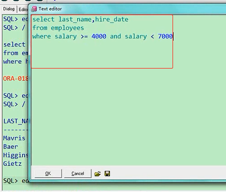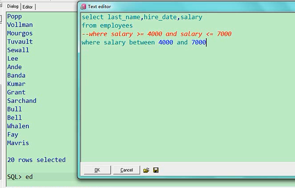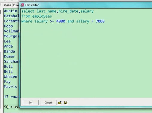 比如说,员工的工资,salary大于等于4000select last_name,hire_date from employees where salary >= 4000 and salary < 7000;我们马上就要学连接符,再加一个and,salary小于7000,这一看都明白吧