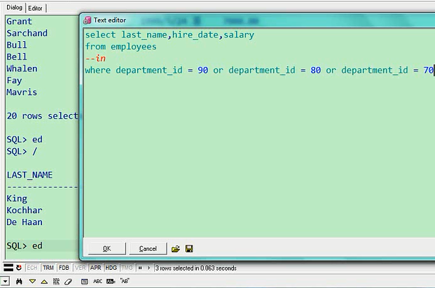 我们看一下这个结果,如果也是20条的话,意味着这个确实是包含边界的,如果不到20,那肯定就是不含边界的,我们看一下结果,是20条,所以between and是含边界的,他表示在这两个值之间,且含边界,这是between and,下一个概念叫,in,下一个关键字叫in,in是什么意思,我们给大家说一下,这里我们讲in,where,我们现在这样写,我们刚才查了90号部门,我们之前是这样写的select last_name,hire_date,salary from employees where department_id = 90;我们这里就不加分号了,在外边去加分号,一共有三个人,现在我想查询这个事,说员工在92号部门,或者是在80号部门,再或者是在70号部门,这个应该怎么写,我们一会结合我们要讲的连接符,大家想到了可以这样写select last_name,hire_date,salary from employees where department_id=90 or department_id=80 or department_id=70;