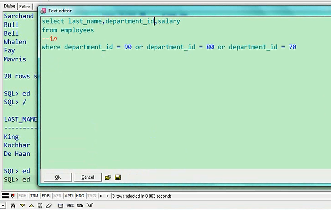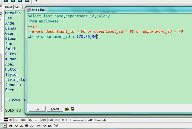 我们看一下,刚才列出来38条记录,都是70号,80号,90号部门的,一共是38条记录,那我们可以像刚才那样的写法,or来连接,也可以使用in,使用in的话就这样写,where department_id,不用等号,in,我用一个小括号括起来,里面写上70,80,90select last_name,department_id,salary from employees where department_id in(70,80,90);