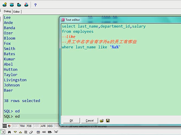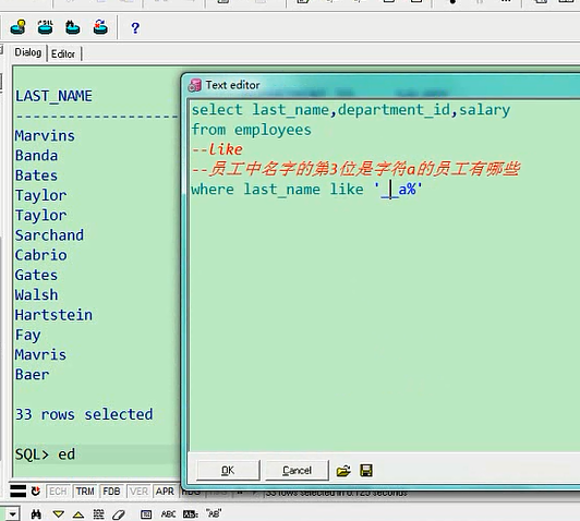 33个人第二个字符是a,如果第三个字符是a,那就加两个下划线select last_name,department_id,salary from employees where last_name like '__a';