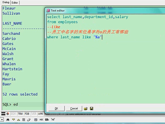 就是名字含有a,后边a可能没有了,那他就是最末尾的一个值,没有关系,也是包含的,一共是52条记录,大家你看一下,这些名字当中是一定是含有a的,一定是含a的,像这个他的末位是a,没有问题,这是我们说的百分号,如果你要是把后面这个去了,就意味着员工中名字末位是字符a的员工select last_name,department_id,salary from employees where last_name like '%a'