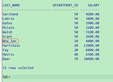 这两个人的last_name是一样的,但是first_name不一样,这是需要大家注意的一点,然后我们再说一个事,这个下划线刚才说了,表示一个字符的意思,你再加一个表示第四个字符是a的员工有哪些select last_name,department_id,salary from employees where last_name like '___a';那你假设说有这样一种情况,如果有一个员工的名字就是有一个含有下划线的,员工的名字中含有_的员工有哪些他名字就是下划线,现在我们这个表里是没有含下划线的,我生成一个,比如我这里面最后一个人,我把他的名字给改一下,把他的名字中含有下划线,这个操作我们在后面会讲,这里你仅仅看一下就可以了update employees set last_name = 'Wha_len' where last_name = 'Whalen';