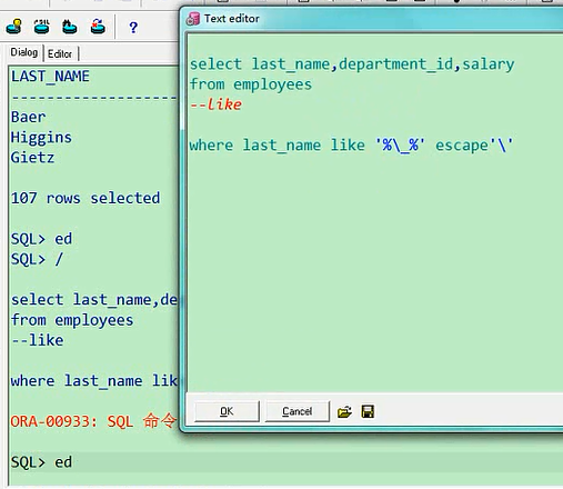 但是你这样写的话出来107条记录,因为此时他表示的是一个字符,相当于这个名字中只要有字符就行,他不是表示的下划线,这肯定不行的,如何让下划线不让他表示一个字符,就本身下划线的意思呢,需要一个转义字符,转义字符怎么写select last_name,department_id,salary from employees where last_name like '%\_%' escape '\';