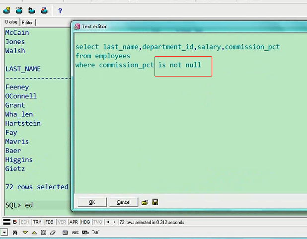 转义字符让下划线不再是特殊的含义,我们说的叫like,三个说完了,我们再说第四个,IS NULL,说他是空的,这个怎么来理解呢,我们在这个表当中有一个列,是有空值的,空值如果参与到运算的话,结果也是空值,当时哪个变量是空,commission_pct,这个叫员工的奖金率,他有可能是空的,那我们就把空的给查询出来select last_name,department_id,salary from employees where commission_pct is null