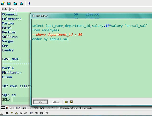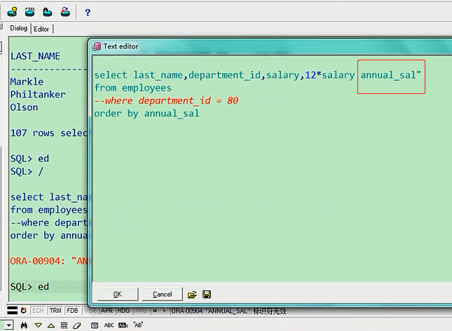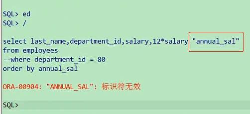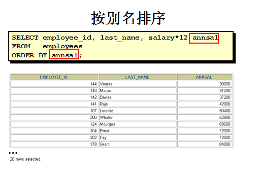 这个你一说你就明白了,我现在输出了员工的salary,我还把他一年的工资输出一下,12*salary,然后给他取个别名,我们别名用双引号,也可以省略,annual_salselect last_name,department_id,salary,12*salary "annual_sal" from employees order by annual_salorder by就按我们刚才的annual_sal