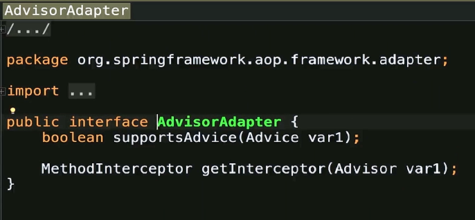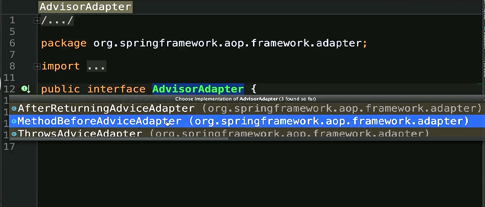在JDK里的一些应用,我们打开一个类,XmlAdapter,我们看一下这个名字就可以很充分的说明他是一个Adapter,那这个类是JAXB包下的,public abstract class XmlAdapterpackage javax.xml.bind.annotation.adapters;在JDK中处理XML序列化和反序列化使用的,那这里面一个构造器protected XmlAdapter() {}还有两个方法public abstract BoundType unmarshal(ValueType v) throws Exception;public abstract ValueType marshal(BoundType v) throws Exception;public @interface XmlJavaTypeAdapter 很明显这个是一个注解,那我们在使用XML序列化的时候,也经常使用XML里面的注解,另外我们看一下他的包,我们看到annotation下有一个adapters,那这里是一个适配器的注解,我们怎么使用呢,例如我们在做序列化和反序列化的时候,对于时间类型我们自己可以写一个类,同时继承这个抽象类,然后实现unmarshal这个反序列化方法,同时再实现marshal序列化方法,我们只要实现自定义的适配器就可以了,那在Spring中使用适配器也使用的非常广泛,那我们先看一下Spring中的使用AOP的一个案例,打开AdvisorAdapter,我们看到这个包在aop下边