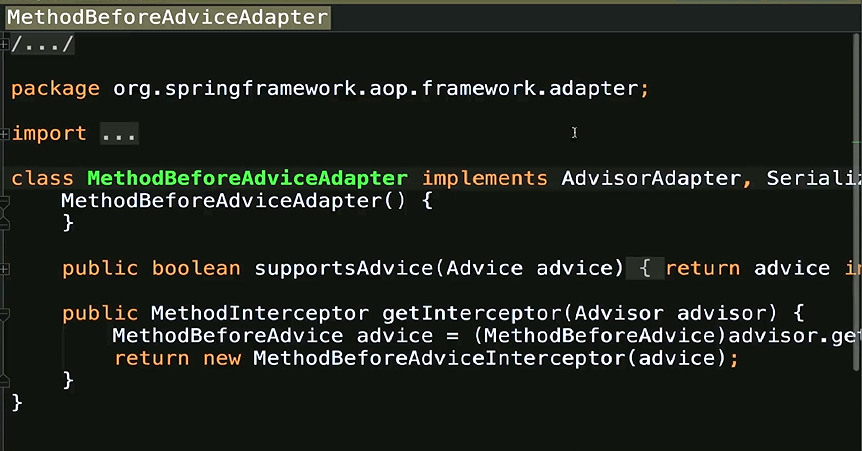 很明显每一个Advisor中的advise都要适配成对应的MethodInterceptor对象,那我们看一下AdvisorAdaptor是一个接口,我们看一下他的实现,我们就看一下MethodBeforeAdviceAdapter