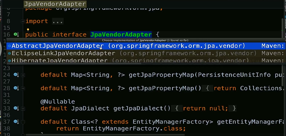 我们看一下JpaVendorAdapter,在Spring的ORM中,对于JPA的支持呢,也是采用了适配器的方式,我们看一下,首先JpaVendorAdapter,是一个接口,我们看一下他的子类也就是他的实现类,有哪些,我们看到有一个抽象的JpaVendorAdapter