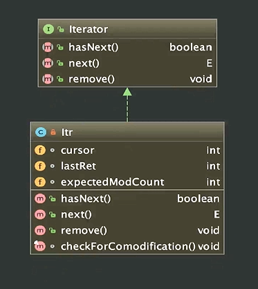 }这里面只用了一个内部类来实现,private class Itr implements Iterator 就是这个,这里面就是全交由子类来实现了,使用不同工厂类中的iterator方法能够得到不同的具体产品的实例,我们可以认为ArrayList在这里边是一个具体的实现工厂,他呢实现了这个工厂方法,而具体的抽象产品呢,又是Iterator这么一个接口,public interface Iterator 具体抽象产品已经找到,那实际生产出来的产品呢,那就是ArrayList里面的Itr对象,private class Itr implements Iterator这个就是具体的产品,他实现了Iterator接口,然后这里边写这么一个实现,同时在具体的工厂里面,返回了具体的产品,这个产品也就是说Iterator抽象产品的一个实例,我们可以类比来看,Collection相当于我们里面的VideoFactory,ArrayList就相当于具体的实现工厂,例如JavaVideoFactory,PathonVideoFactory,而抽象产品,就是Iterator这么一个产品,而在我们的课程当中,就是Video这么一个抽象类,它是一个抽象产品,然后实际的具体产品就是ArrayList里面的Itr这么一个类,他实现了抽象产品,那Itr对应我们工厂里面的,就是JavaVideo,PathonVideo,或者FEVideo,那我们看一下,Itr这么一个类图