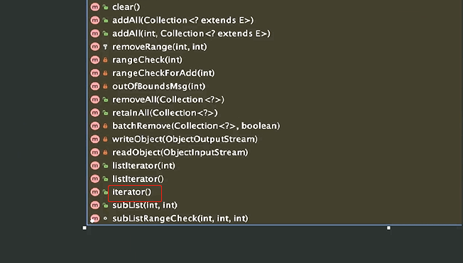 从这里面就可以看出来,ArrayList实现的一个接口,以及和其他抽象类的一个关系,那我们重点来关注一个方法,我们看一下ArrayList的方法,我们找到iterator这么一个方法,也就是说ArrayList中的iterator方法