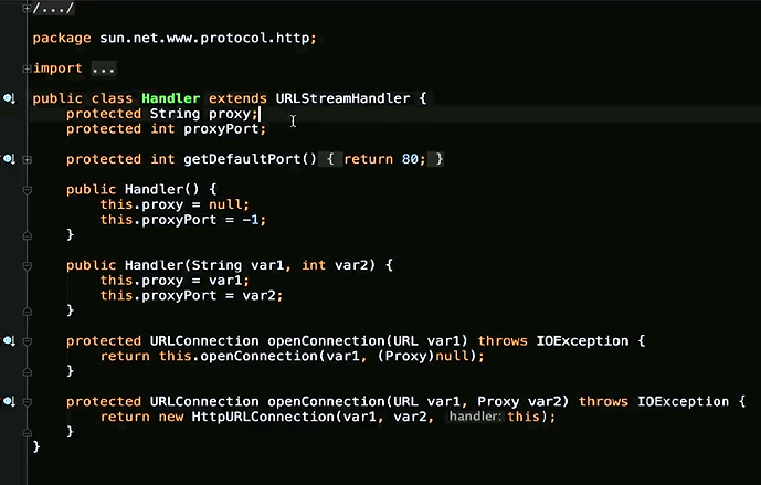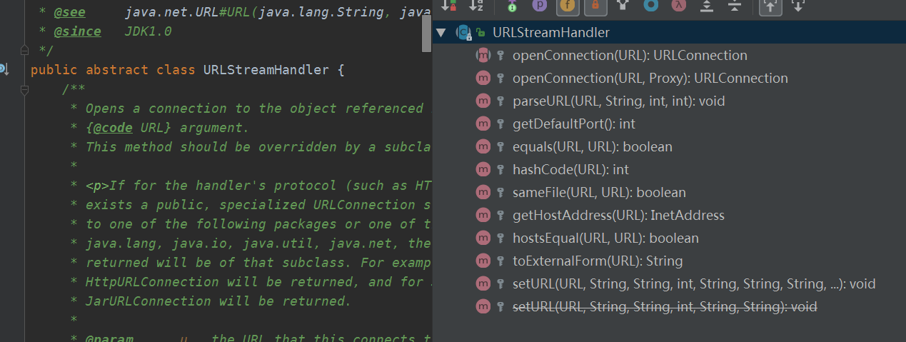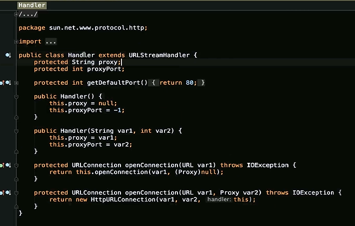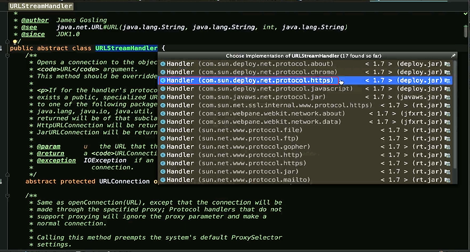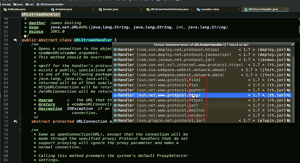 既然他返回的是一个抽象类public abstract class URLStreamHandler {/*** Opens a connection to the object referenced by the* {@code URL} argument.* This method should be overridden by a subclass.** If for the handler's protocol (such as HTTP or JAR), there* exists a public, specialized URLConnection subclass belonging* to one of the following packages or one of their subpackages:* java.lang, java.io, java.util, java.net, the connection* returned will be of that subclass. For example, for HTTP an* HttpURLConnection will be returned, and for JAR a* JarURLConnection will be returned.** @param u the URL that this connects to.* @return a {@code URLConnection} object for the {@code URL}.* @exception IOException if an I/O error occurs while opening the* connection.*/abstract protected URLConnection openConnection(URL u) throws IOException;他肯定是由子类来实现他的,这里面有N多Handler,有deploy发布包下面的