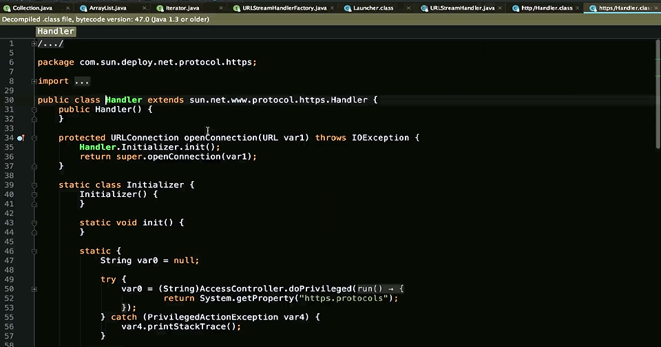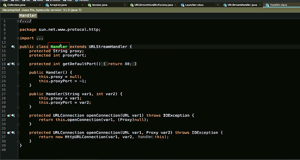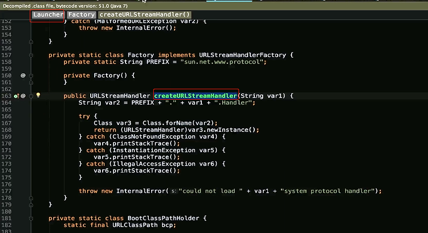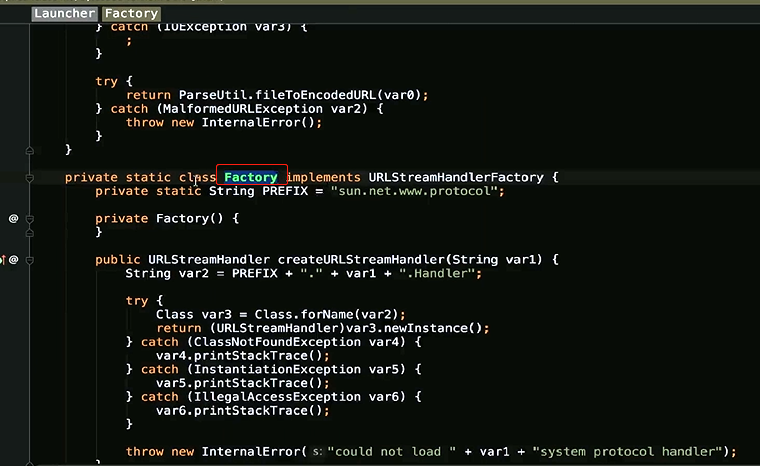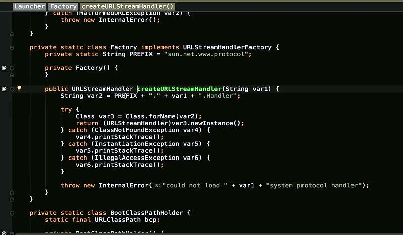 }之前也说了,无法具体描述的话,我们使用抽象类和抽象方法也可以,使用一个接口和一个方法命名,也是OK的,那么我们来看看他的具体实现,Launcher Factory createURLStreamHandlerprivate static class Factory implements URLStreamHandlerFactory {private static String PREFIX = "sun.net.www.protocol";private Factory() {}public URLStreamHandler createURLStreamHandler(String var1) {String var2 = PREFIX + "." + var1 + ".Handler";try {Class var3 = Class.forName(var2);return (URLStreamHandler)var3.newInstance();} catch (ReflectiveOperationException var4) {throw new InternalError("could not load " + var1 + "system protocol handler", var4);}}