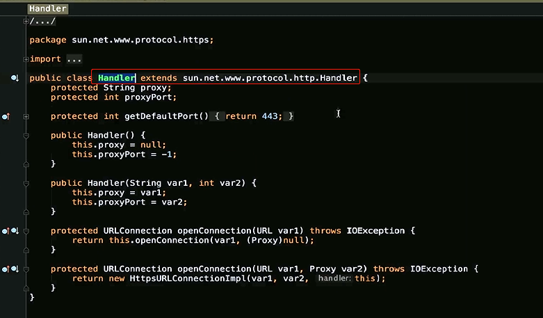 这个Handler直接继承了这个抽象类,那这个Handler里边啊,openConnection方法抽象方法,并且它是一个protected,所以子类必须会实现他,也就是说openConnection,这个是http包下面的Handler,那我们再看一下其他的实现类,例如有一个https的
