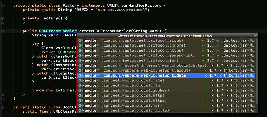 里面通过Class.forName来获取对象,而具体对象就是URLStreamFactory很多实现的一个子类