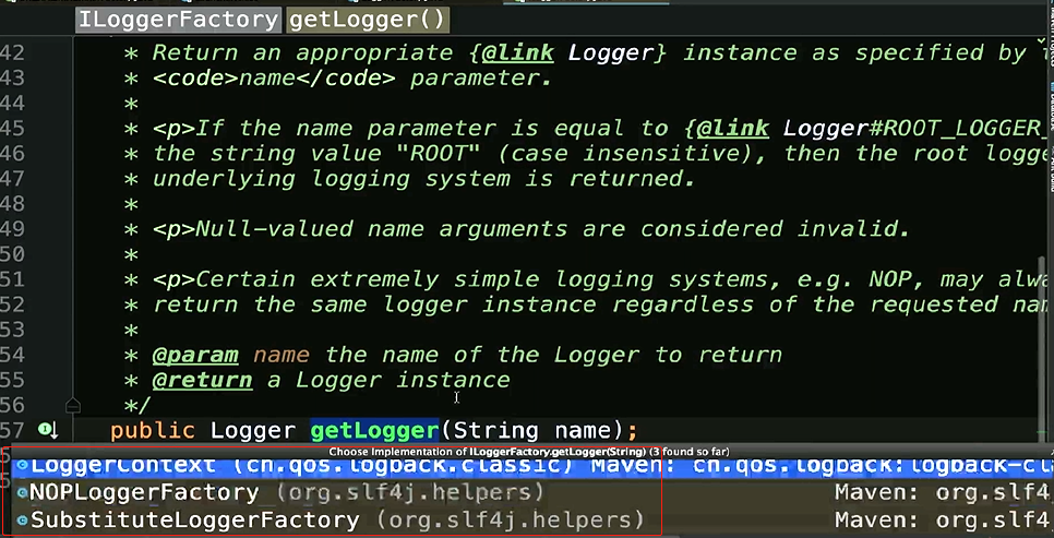 他实现了URLStreamHandlerFactory,这个Factory就相当于我们的JavaVideoFactory,PythonVideFactory,所以工厂方法所在的类,还有具体的创建者,还有抽象的产品,和具体的产品,我们都找到了,那这一部分也是工厂方法,在JDK中的一个重要体现,我们再看logback中的一些应用public interface ILoggerFactory {/*** Return an appropriate {@link Logger} instance as specified by the* name parameter.* * If the name parameter is equal to {@link Logger#ROOT_LOGGER_NAME}, that is * the string value "ROOT" (case insensitive), then the root logger of the * underlying logging system is returned.* *