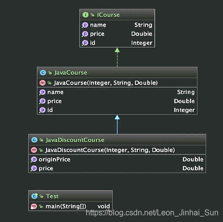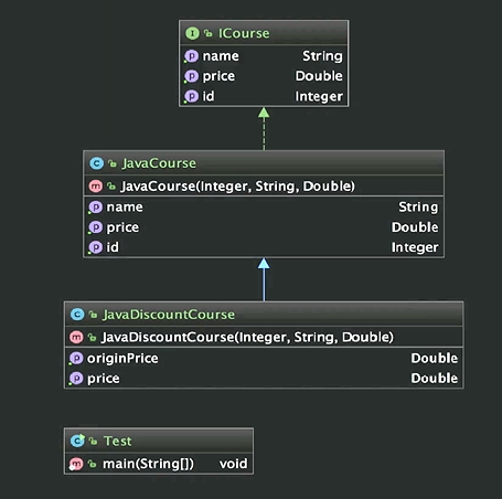 package com.learn.design.principle.openclose;/*** 现在我们有一个测试函数* * 我们现在来看一下类结构图* 现在的类结构图非常的简单* ICourse这个是一个接口* JavaCourse这里是一个类* 这个类实现这个接口* 非常清晰* 我们一定要善用IDEA里面的查看工具* 在我们看源码的时候非常有用* 这里和标准的UML有一点小小的差异* 比如I就代表Interface* 也没有用尖括号* 我们能看出来* 这个是他的类型* 现在的类结构也是非常的简单* 我们也输出了信息* 双十一和618要进行一个打折活动* 那我们怎么来开发这个需求呢* * 现在我们回到test里面* * * * * @author Leon.Sun**/