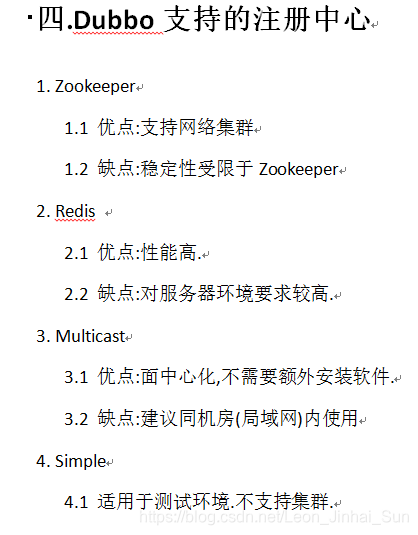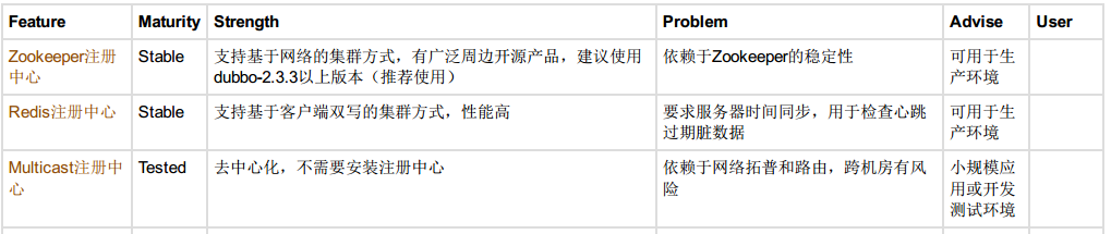 在Dubbo中支持几种注册中心,在Dubbo中一共支持4种注册中心,我们看一下,官方文档已经明确的告诉哪四个,一共支持这四种注册中心,看看第一个zookeeper,第一个叫zookeeper,动物园管理员,我们先看第一个吧,他就是我们注册中心类型,官方告诉我们的,这个方法支持网络的集群方式,有广泛的周边开源产品,建议使用2.3.3版本以上,dubbo的2.3.3版本,我们用2.5.3,他们建议用多少啊,2.3.3,那咱们用2.5.3肯定是行的,第一个注册中心是官方推荐的,他好就好在支持网络集群,所以一定要明白,他的一个优点,支持网络集群,他的缺点problem,依赖于zookeeper的一个稳定性,zookeeper是一个软件,缺点稳定性受限于zookeeper,除了这个以外,再下面第二个,Redis注册中心,这又是一个软件,这是一个No数据库软件,数据库软件,后面会学的一个重点的东西,但是咱们不用这个注册中心,是zookeeper的一个周边功能,一个小功能,用它的话不是特别好,而zookeeper是专门干这个事情的,Redis首先看一下他,支持客户端双写集群模式,它的性能较高,但是问题特别严重,要求服务器时间同步,用于检查心跳过期脏数据,就是我们在配置的时候,的确什么都可以配,但是配置必需特别精细,如果配置不精细,集群可能会导致失败,所以这里要求太高了,而且只是一个周边小功能,他的优点是性能高,我们后面学Redis的时候,最大优点,这个软件的优点就是性能高,他是个内存型数据库,什么叫内存型数据库,咱们MYSQL的数据都是存在硬盘里,每次读取的时候是IO操作,他就在内存放着呢,效率特别高,然后再往下优点,缺点对服务器环境要求较高,这是他Redis,Multicast注册中心是Dubbo老版本的推荐版本,不需要配置,但是他依赖于拓扑和路由,跨机房有风险,什么意思呢,注册中心和provider必须在一个机房内,同一个路由内,啥意思,就是不能够通过互联网,必须局域网,Multicast是一个免中心化,不需要安装任何软件,这就是他的优点,上面都是需要装一下zookeeper或者redis,而这个就不需要装东西,缺点是建议同机房局域网内使用,最后一个东西不行,看这儿,使用Simple注册中心,注册中心本身也是一个RPC服务,他不支持集群,测试版从来没有人用过,Simple只适用于测试环境的,不支持集群,什么叫不支持集群呢,后面会讲啊,先不着急,什么叫集群现在简单提一下吧,本来现在一个人干的活,如果我们现在装一个MYSQL,用MYSQL举例不太好,假设有一个MYSQL,正常都是访问这一个,现在咱们让三个MYSQL同时进行工作,我们访问的时候,让他们三个协调工作,怎么个协调法呢,有的时候访问MYSQL1,有的时候访问MYSQL2,有的时候访问MYSQL3,这有什么好处,是不是分担压力,这三个的环境是完全一样的,这叫集群,跟分布式有点像,分布式是什么,是把一个整体拆分成很多部分,然后分别部署,这个每一个都是单独的整体,就是个整体,让多个整体相互协调工作,这叫集群,把一个东西拆分成多个部分,分别部署,这叫分布式,一拆多,一个,1加1等于多,一拆成多个,他两的区别,那我们现在看一下在这里面,咱们用谁呢,zookeeper是专门做这个东西的,所以下面我们要做的一个事情,Dubbo支持的注册中心