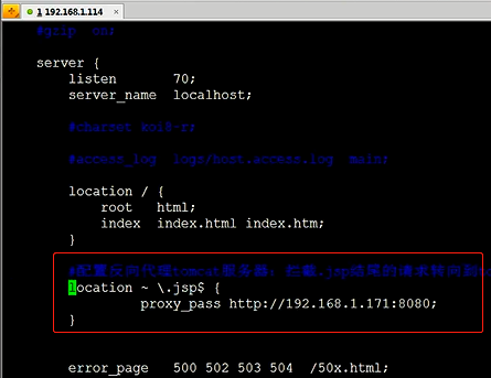 你看这儿,这不就是动静分离吗,你只要访问我的域名,当然我这里是localhost,你访问我70端口的时候,请求是不是都进来了请求都进来之后,通过location进行过滤,如果你是一个斜杠/,匹配上了的话,当然这块你可以自己去写正则表达式,访问jpg,js结尾的,图片直接仍得到nginx服务器上,静态的,包括js,css,访问直接走这里就行了,$符号表示什么结尾,开头是^这个,\.,因为.得转义一下,你这个.jsp结尾的请求,你都得给我转到这下面,看见了吗,这个服务器一定是http的位置,然后这个proxy_pass这个配置项,代理的key,proxy_pass是固定的,value是你自己随便来的,我这里是114,那我这里就直接这么去写吧,只要你是.jsp结尾的请求,都给我转向到114的8080,可能他也是一个服务,一回我再解压一个tomcat,你就会发现了,配置就这么简单