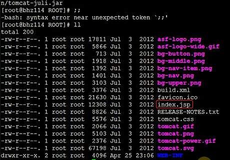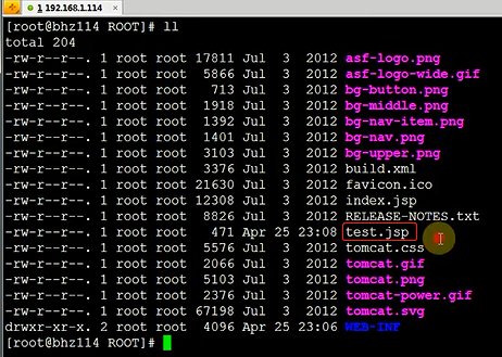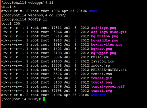 当前我这里又tomcat吗,可能就是咱们之前讲solr的时候,我再解压一个吧,cd到software下,然后tar -zxvf tomcat,然后-C /usr/local下面,我刚才去解压了一个tomcat,这就多了一个tomcat了,cd到tomcat的webapps下,这里面你会发现这么几个东西,其实这些我都可以干掉,ROOT其实即使我干掉重启也会生成,所以我干脆就不动他了,我就rm -rf docs/,rm -rf examples/,rm -rf host-manager/,rm -rf manager/,就剩一个ROOT,我cd到ROOT下,ROOT正常TOMCAT启动好以后,访问的就是ROOT下的index.jsp文件