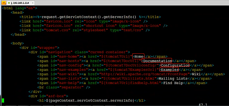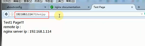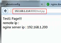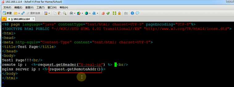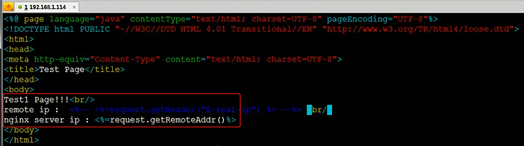 然后我去vim test.jsp,这是我自己随便写的一个JSP文件,主要是TEST1 PAGE,啥也没写,这个你不用去管,可能是空的,因为我注释掉了,主要是看nginx server ip,然后叫做request.getRemoteAddr(),把当前客户端请求的ip给我得到,然后去打印一下,差不多就是这样的一个小界面