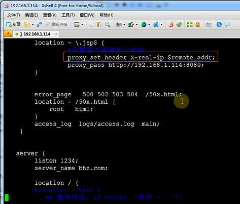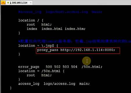他就直接进来了,直接访问了当前的JSP,这块我注释掉所以没有,这里是我直接访问tomcat的ip,根nginx没有关系呢,我本地的IP是192.168.1.200,这块能看懂吧,无非就是加一个界面,然后我本地区访问一下test,看见本地访问的ip地址,现在有一个问题产生了,如果要是nginx给我做一个代理会是什么情况呢,我浏览器本机的是200,我去访问nginx,nginx当前的服务器在114上,然后他接收了我的request以后呢,给我代理了一下,然后给我转到了一个后台的tomcat服务器上,这个时候你再去调用remote address的时候,说白了其实你后端的tomcat这个请求啊,他接收的remote其实是nginx server,因为你转了一把手,请求真正过来的是114,并不是200,如果我把tomcat放到另外一个节点下,放到115下,相当于115这个节点启动tomcat,get remote address的时候get的是114,而不是真实的这个200,因为我是经过nginx代理的,是nginx转给你的,会有这样的一个问题,咱们可以把这个重建一下,我现在tomcat已经启动了,刚才我是没有依赖任何的nginx,现在我去依赖一下他,vim /usr/local/nginx/conf/nginx.conf,你看到我的请求是这样的,你如果是后缀是以.jsp结尾的,你这个会经过代理,会转到114下的8080,你可以理解为115下的8080,其实都是一样的,因为我现在开启了两个服务,一个是nginx服务,一个是tomcat服务,相当于请求过来先请求nginx,nginx帮我转到tomcat服务,tomcat get remote address,其实是114,并不是我浏览器真正的访问段,其实已经写完了