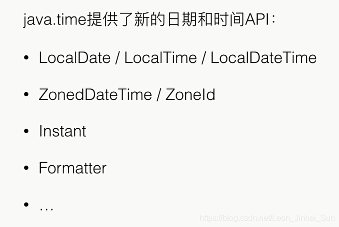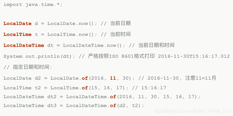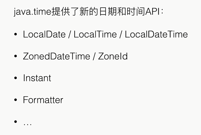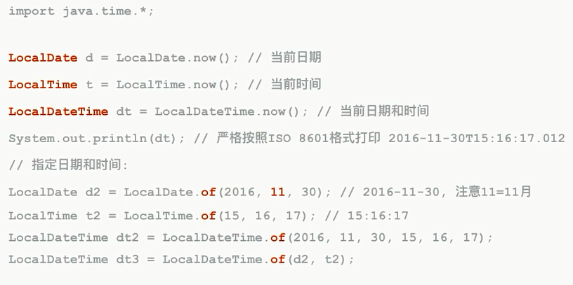 java.time包提供了新的日期和时间的API,新的API主要包括:1. LocalDate/LocalTime/LocalDateTime2. ZoneDateTime/ZoneId3. Instant4. Formatter我们看java.time提供的1. LocalDate: 本地的日期2. LocalTime: 本地的时间3. LocalDateTime: 本地的日+时间java.time提供的新的API主要是有这几个特点:1. 首先严格的区分日期和时间2. 其次所有的类称为不变类,这一点和String非常的类似3. 新的API的Month是从1到12,对应的是1月到12月,4. Week的范围是从1到7,对应的是周一到周日,这样我们就不需要考虑加1和减1的问题了我们可以通过LocalDate.now()获取当前的日期,通过LocalTime.now()获取当前的时间,通过LocalDateTime.now()获取当前的日期和时间,当我们打印LocalDate和LocalTime,或者是LocalDateTime的时候,它是严格的按照ISO-8601的格式打印的我们还可以通过指定日期和时间,可以构造LocalDate,LocalTime,LocalDateTime,方法通过调用of方法,传入年月日,或者是时分秒,得到LocalDate和LocalTime,传入年月日和时分秒,我们可以构造出一个DateTime,或者利用一个LocalDate,和LocalTime对象,构造出一个新的LocalDateTime