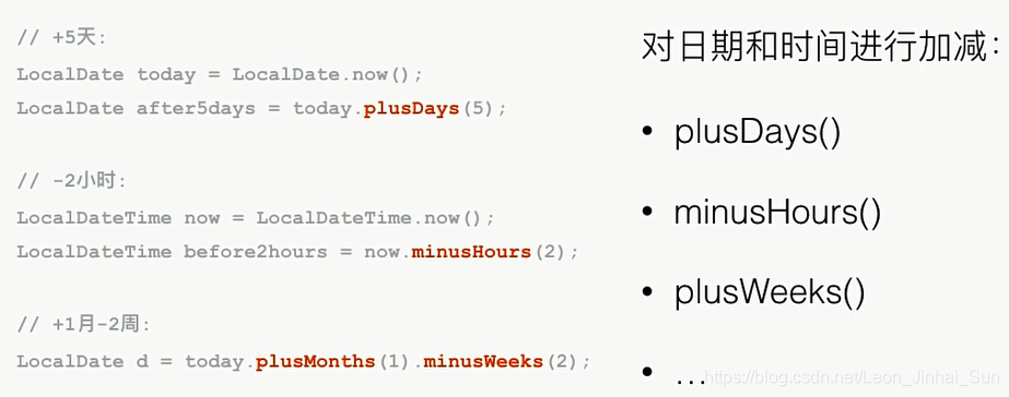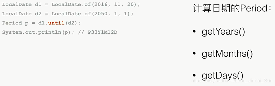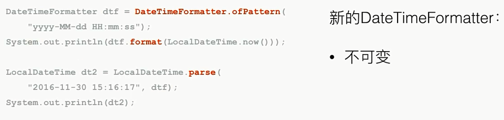新的API同样也提供了DateTimeFormatter对象,他和旧的SimpleDateFormat对象不一样的是,它是一个不可变类,我们通过ofPattern这个方法,传入指定的格式化的字符串,可以得到DateFormatter这个对象,我们同样调用format和parse方法,对日期进行格式化,或者从字符串解析出日期,默认情况下,LocalDate,LocalTime,LocalDateTime,是按照ISO标准格式进行解析的,因此,我们采用的是标准的格式化日期,或者是时间,我们就可以通过LocalDate,LocalTime,LocalDateTime,我们已经列出了几种标准的日期,时间,已经日期和时间的字符串,新的API还有一个重大的更新,就是他增加了日期和时间的运算,我们通过LocalDate的plusDays,传入变量5,就可以在先有的基础上加上5天,注意LocalDate是一个不变类,所以plusDays返回的是一个新的LocalDate对象,类似的我们用MinusHours减掉2个小时,我们可以通过plusWeeks增加几周我们还可以对日期和时间进行调整,例如我们获取到当前的日期,然后我们调用withDayOfMonth,传入1,就可以把日期调整到日期的第一天,我们用withSecond(0).withNano(0)可以把秒和纳秒调整为0,我们还可以通过一个TemporalAdjusters.lastDaysMonth(),我们就可以计算出本月的最后一天,我们可以通过TemporalAdjusters.firstInMonth传入DayOfWeek,例如SUNDAY,我们就计算出了本月的第一个周日新的API还提供了判断日期的先后,我们通过两个日期可以通过isBefore,或者isAfter,来判断他们的先后顺序,我们通过equals也可以判断两个日期是否相等我们还可以计算日期的Period,我们有一个utils方法可以得到一个Period对象,表示某一天到指定的另一天,他之间相差多少日期,例如我们计算2016年1月20号到2050年1月1号,我们可以得到一个Period对象,我们打印这个对象,可以打印P33Y1M12D,表示这个日期相差33年,1个月12天我们通过Priod.getYears(),getMonths(),getDays(),可以分别取出对应的整数