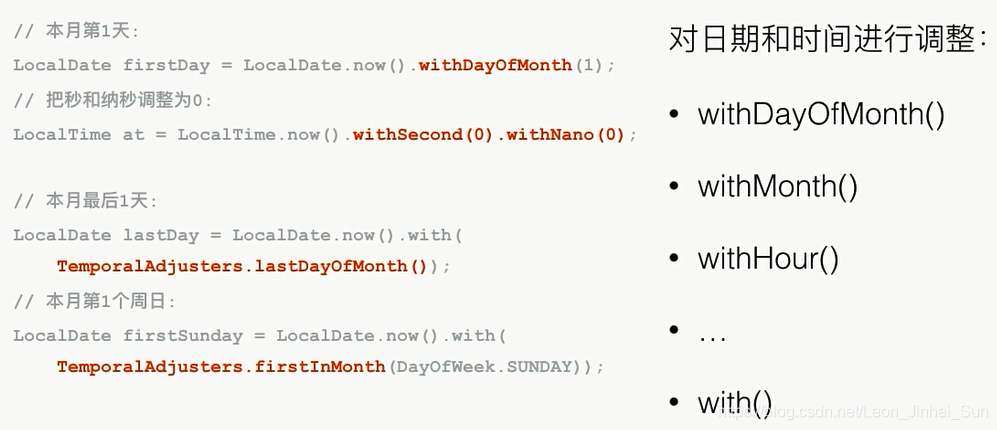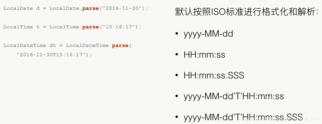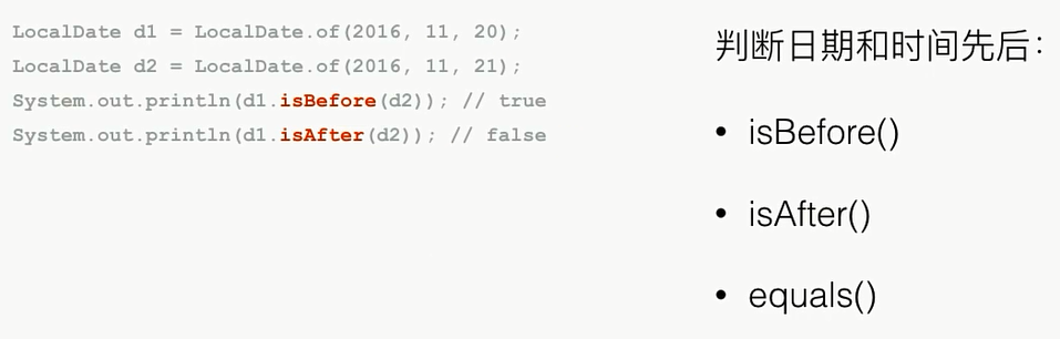 我们要注意,LocalDateTime是无法与Long进行转换的:1. 这是因为从设计上LocalDateTime他是没有时区的概念,因为LocalDateTime他是没有时区,我们也无法确定某一个时刻2. ZoneDateTime他是有时区的,所以他可以与Long交换最后我们总结一下LocalDate,LocalTime,LocalDateTime:1. 他们都是不变类2. 默认按照ISO-8601标准格式化和解析3. 我们使用DateTimeFormatter自定义格式化和解析4. 我们可以通过plusDays和minusHours等方法对日期和时间进行加减,返回新的对象5. 我们使用withDayOfMonth/with等方法调整日期和时间,返回新的对象6. 我们还可以使用isBefore/isAfter/equals判断日期和时间的先后
