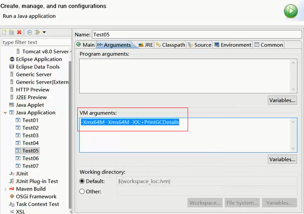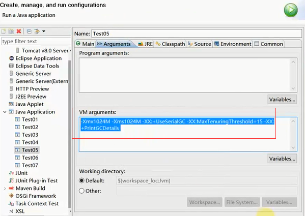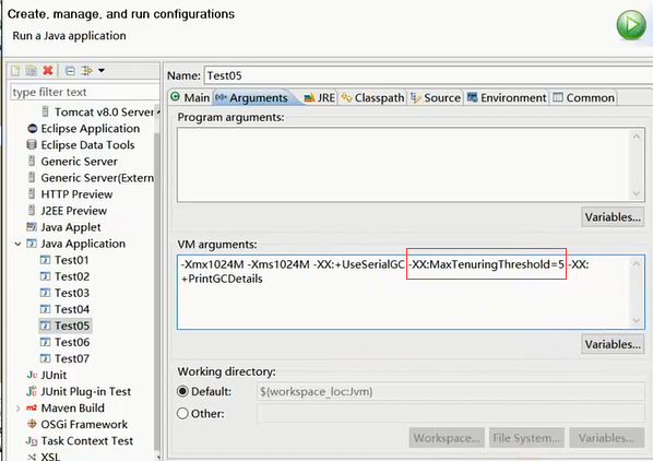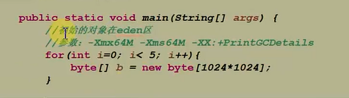 对象初始化的时候要在Eden区,最大的内存分配64M,打印一下情况,for循环是5次,每次申请1M的内存