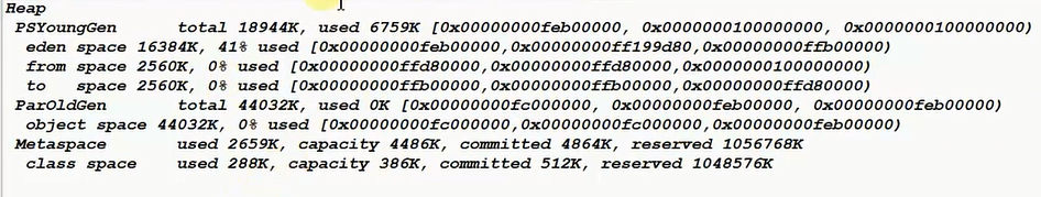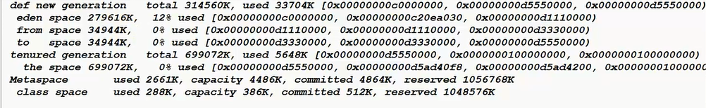 之前我们都是加了-XX:UseSerialGC,默认都是使用串行垃圾收集器,这种是PSYoungGen,这种是JDK默认自带的垃圾收集器,我们的数据是新生代,老年代,基本上我们used是0%,也就是我们的对象都用到了新生代