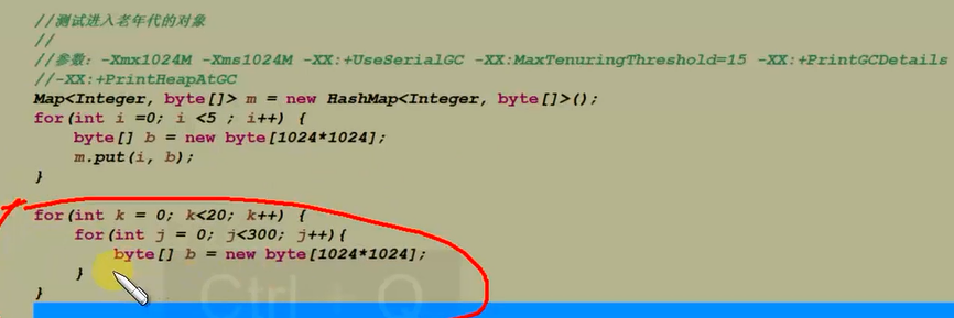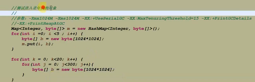 实例化出来一个hashMap,循环5次,每次申请1M的内存,内存不释放,直接放在map里面,接着每次申请好多好多M,6000次的循环,6000乘以1M,6个G,我要做6个G的内存,这样的话我要配置这个参数之后,这个参数我初始化是一个G,最大也是一个G,然后使用的是串行的垃圾收集器,然后我进入老年代的次数是15,对象进入老年代的次数是15,然后我去打印一下详细信息,后来这个程序的目的是让程序直接停