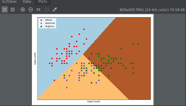 # -*-coding:utf-8-*-# 导入模块import matplotlib.pyplot as pltimport numpy as npfrom sklearn.datasets import load_irisfrom sklearn.linear_model import LogisticRegression# 读入数据iris = load_iris()X = iris.data[:, :2]Y = iris.target# 建立模型lr = LogisticRegression(C=1e5, solver='liblinear')lr.fit(X, Y)# 生成两个网格矩阵h = .02x_min, x_max = X[:, 0].min() - .5, X[:, 0].max() + .5y_min, y_max = X[:, 1].min() - .5, X[:, 1].max() + .5xx, yy = np.meshgrid(np.arange(x_min, x_max, h), np.arange(y_min, y_max, h))# 预测Z = lr.predict(np.c_[xx.ravel(), yy.ravel()])Z = Z.reshape(xx.shape)# 绘制plt.figure(1, figsize=(8, 6))plt.pcolormesh(xx, yy, Z, cmap=plt.cm.Paired)plt.scatter(X[:50, 0], X[:50, 1], color='red', marker='o', label='setosa')plt.scatter(X[50:100, 0], X[50:100, 1], color='blue', marker='x', label='versicolor')plt.scatter(X[100:, 0], X[100:, 1], color='green', marker='s', label='Virginica')plt.xlabel('Sepal length')plt.ylabel('Sepal width')plt.xlim(xx.min(), xx.max())plt.ylim(yy.min(), yy.max())plt.xticks(())plt.yticks(())plt.legend(loc=2)plt.show()