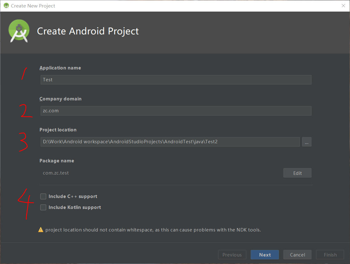 - 在1处填入项目名称,2处填入唯一域名(后面的包名由域名反写生成),3处填入项目文件存放位置,4处选择是否支持C++和Kotlin。图片中警告可以忽略。