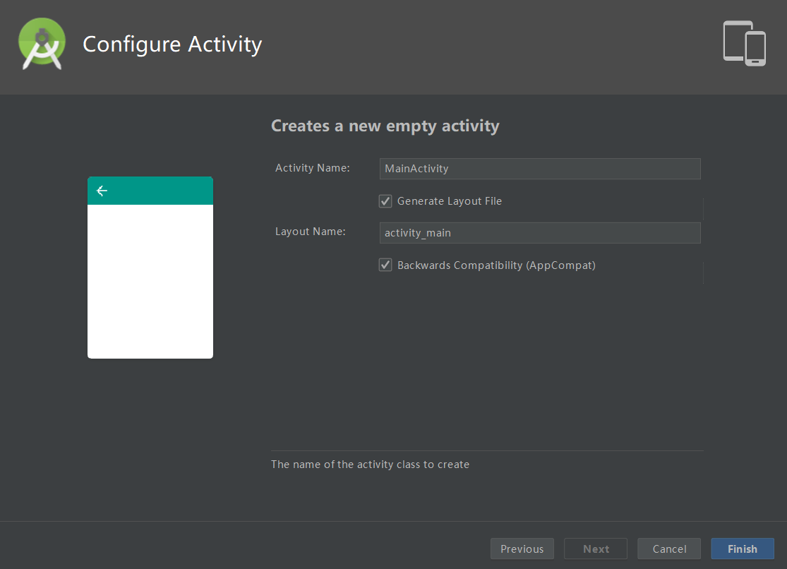 - 配置这个Activity的java文件及布局文件名。点击Finish完成创建。