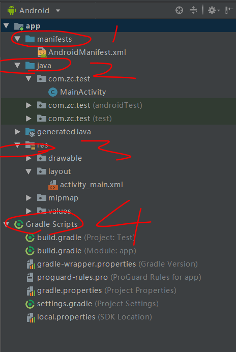 - 然后,3处的res只有在gradle完成编译后能够看到,否则为resources文件夹,这里面放的是app的资源文件,如传给java代码的布局文件和布局id。(这种安卓开发方式把res文件夹封装成一个对象R,用的非常广泛,毫不夸张每个Activity都使用到了)