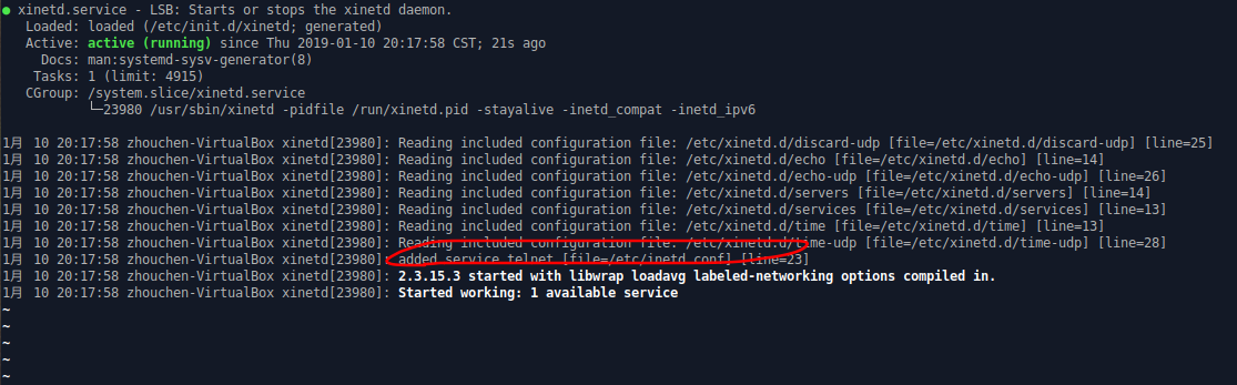 可以在日志中看到一行如下图,说明telnet服务安装成功且已经被xinetd管理,且已经在正常运行。