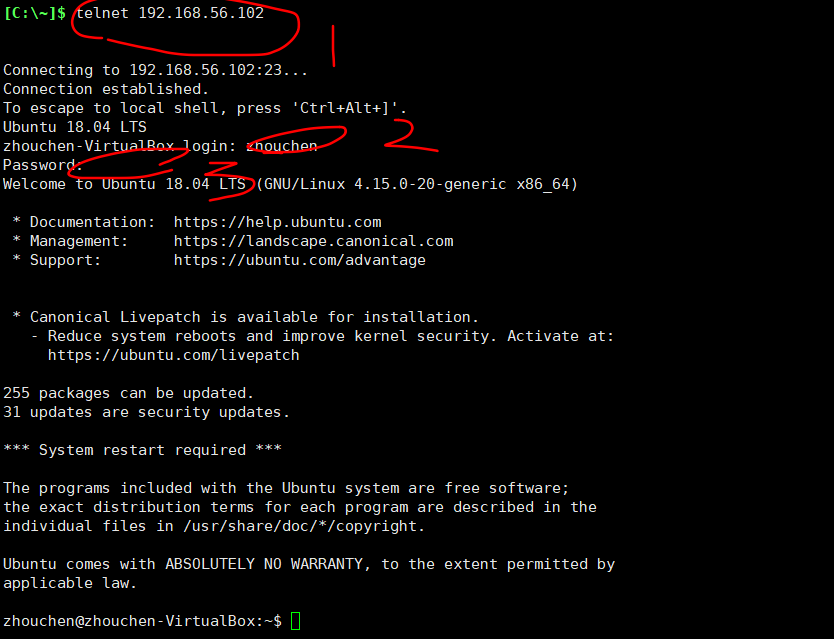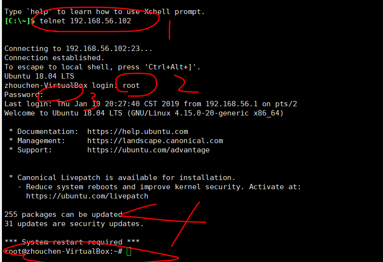 系统版本为Ubuntu 18.04,使用该系统机作为服务机,安装telnet服务,使用windows平台的xshell作为访问机,安装了telnet客户端(xshell集成)。