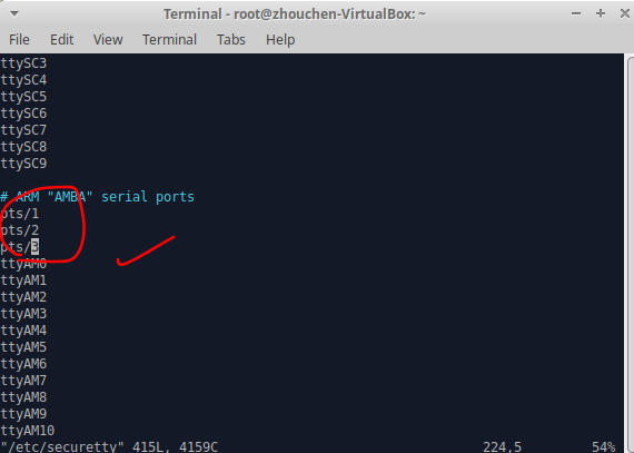 然后,修改文件,运行root系列用户登录,即将pts系列用户加入/etc/securetty文件中。