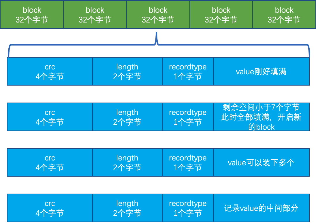 // https://github.com/google/leveldb/blob/master/db/log_format.hnamespace log {enum RecordType {// Zero is reserved for preallocated fileskZeroType = 0,kFullType = 1,// For fragmentskFirstType = 2,kMiddleType = 3,kLastType = 4};static const int kMaxRecordType = kLastType;static const int kBlockSize = 32768;// Header is checksum (4 bytes), length (2 bytes), type (1 byte).static const int kHeaderSize = 4 + 2 + 1;} // namespace log