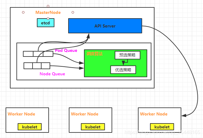 通过调度算法,为待调度Pod列表的每个Pod,从Node列表中选择一个最合适的Node。 然后,目标节点上的kubelet通过API Server监听到Kubernetes Scheduler产生的Pod绑定事件,获取对应的 Pod清单,下载Image镜像,并启动容器。