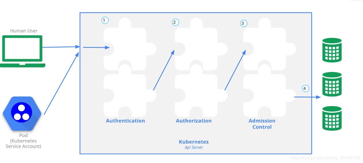 通过api-server创建资源等都需要权限校验,需要完成认证,授权,准入等验证后才可以操作资源,具体流程如下