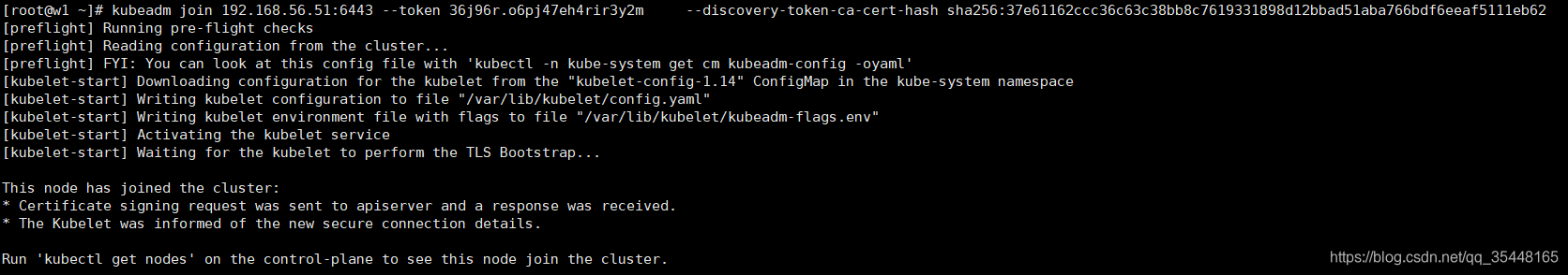 kubeadm join 192.168.56.51:6443 --token 855f8b.ee4vjcbjmgfcs3zq \--discovery-token-ca-cert-hash sha256:37e61162ccc36c63c38bb8c7619331898d12bbad51aba766bdf6eeaf5111eb62