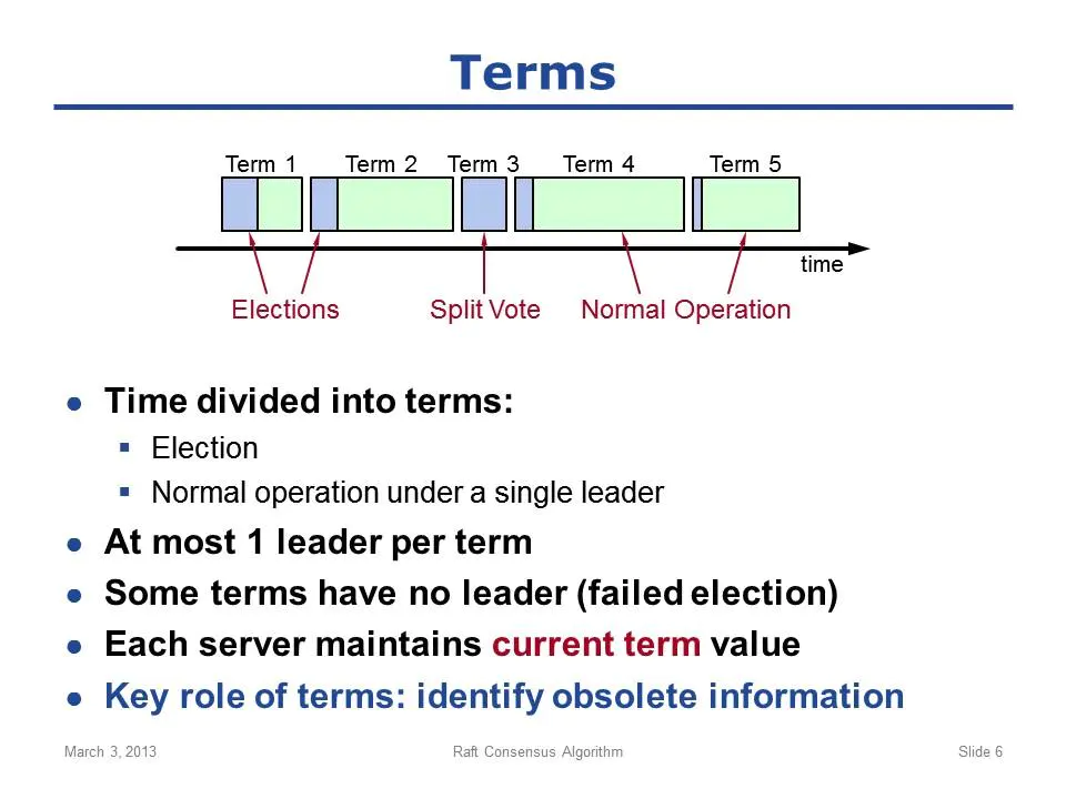 term的作用非常重要,其核心作用是让raft能够及时识别过期信息,比如某个认为当前term是2的server跟另外一个认为当前term是3的server进行通讯,我们就知道前一个server的信息是过时的;我们总是使用最新term的信息;后面的讲解中有几种场景,大家可以看到term用来检测并去除过期信息。