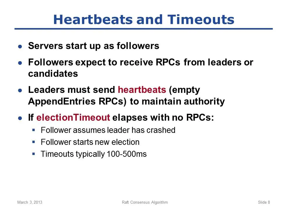 (感性认识+直觉:leader为了保持自己的权威地位,必须不停发心跳;一旦某个follower在election timeout内没收到心跳,就自认为leader已挂,自己翻身开始竞选leader;类似于皇帝通过发心跳来压制子民,一旦某人收不到心跳包,就起身造反,但造反不一定能成功)