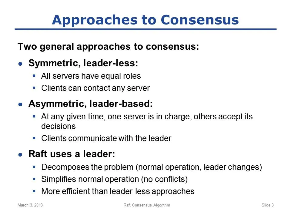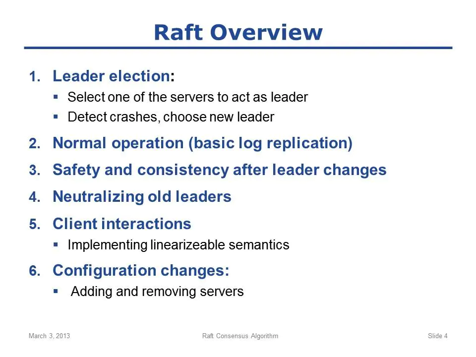 最近看了Ongaro在2014年的博士论文《CONSENSUS: BRIDGING THEORY AND PRACTICE》的部分章节,对raft有了初步的理解。其中论文中提到用于教学的user study,个人感觉非常不错,言简意赅,特此分享出来。本文基本与原讲解一致,又加上了笔者的一点理解。