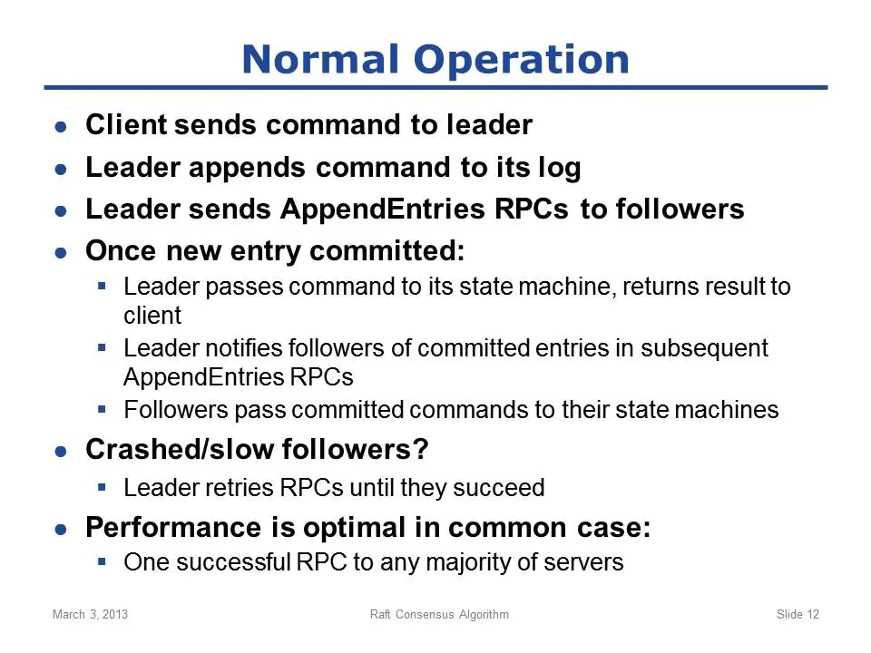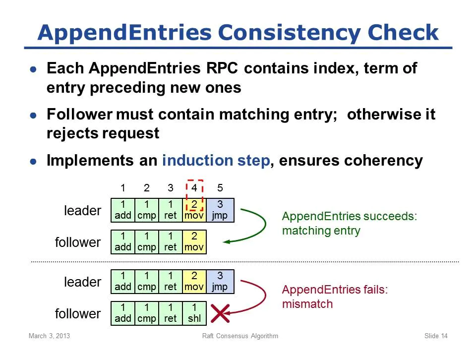3)注意2)中的consistency check非常重要,显而易见,这其实是个归纳推理过程:每次接受新entry的时候,都必须要求前一个entry必须匹配;以此类推,才能得出前一个slide里面的结论:一旦两条entry相同,则这条entry之前的所有entries也必定相同,也只有如此才能保证log的一致性。
