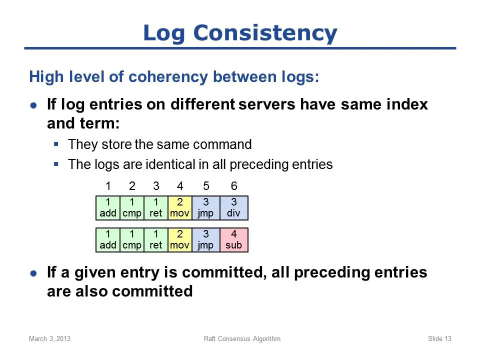 (点评:这两点非常重要,贯穿整个后续的讲解;最核心的就是:index和term唯一标识一条entry;其他结论都可据此推导出;一言以蔽之,就是两句话:a.只要发现某两个log中的某个entry的index和term都相同,则这两条log中这条entry包括之前的所有entries都相同 b.只要在某条log中发现某个entry已提交,则这条entry之前的所有entries也一定已提交)