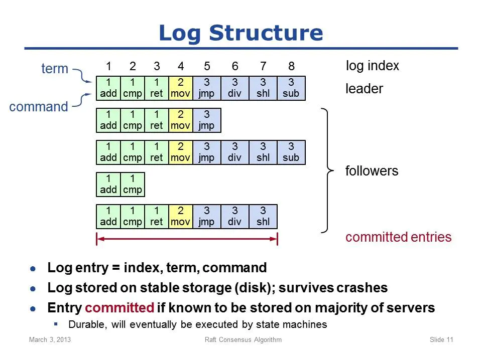 a. command:即可以在state machine上执行的具体指令;指令的格式是由客户端和state machine协商制定的,consensus module毫不关心,你可以把它想象成是某个方法和对应的参数;