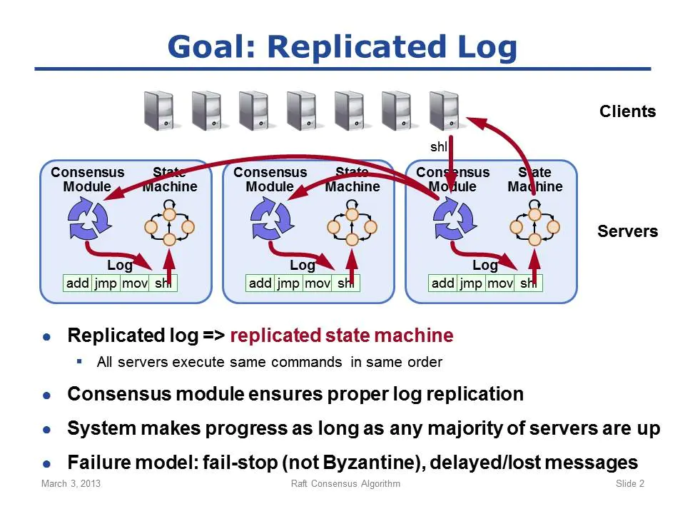 Raft的总体目标是将log完全一样地复制到集群中的所有机器上,用来创建所谓的Replicated State Machine(多副本状态机,就是具有多个copy的应用程序)。