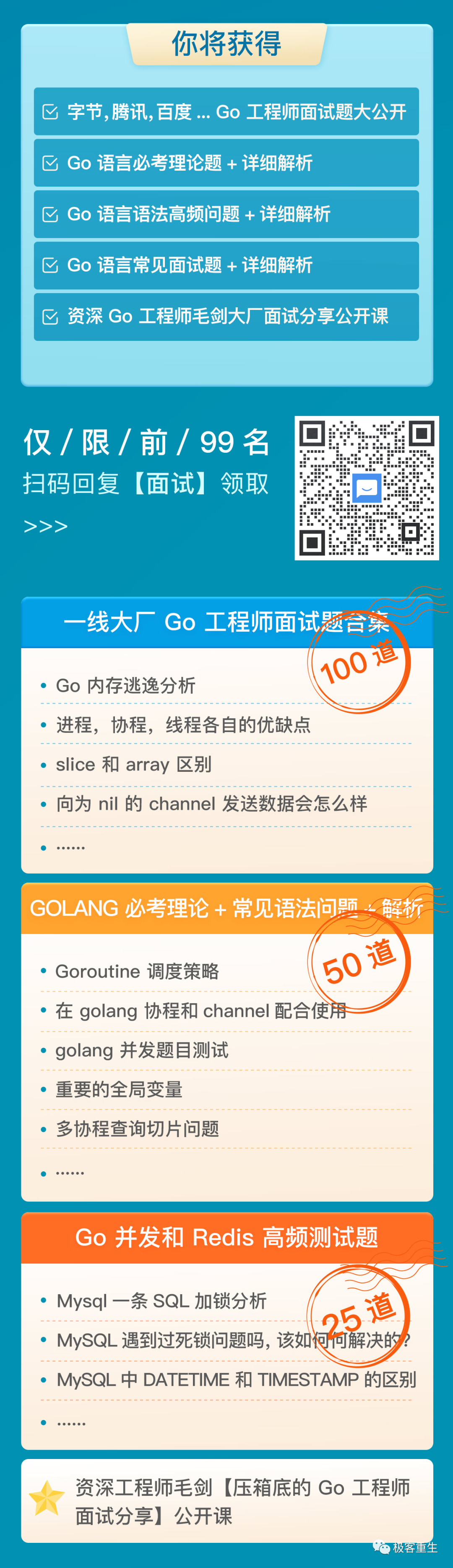 给大家分享一份免费的 Go 工程师面试题,涵盖不少大厂高频必考点,可以帮助大家了解一下现在的一线大厂、现在的工程师的市场究竟是什么样的需求。需要的同学可扫码免费领取。